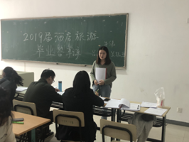 2019年5月8日,国际商学院旅游管理系2019届酒店管理与旅游管理专业毕业论文答辩工作在我校1-136教室顺利进行。参加本次答辩的2019届毕业生共20位,答辩组教师有旅游管理系系副主任牛伟、酒店管理专业老师吴振杰、空中乘务专业老师吕雨阶。同时,17、18级多名学生自发前来答辩现场进行观摩学习。