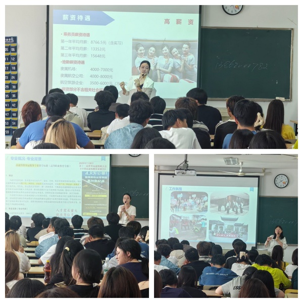 然后,空中乘务专业负责人吕雨阶老师、高速铁路客运服务专业负责人佘冬翠老师、酒店与旅游管理专业负责人马雪琴老师分别就专业情况与未来发展为学生们做了详细介绍,在场学生都特别专注,积极提问,言语中充满着对未来的憧憬与期待,现场气氛热烈而融洽。