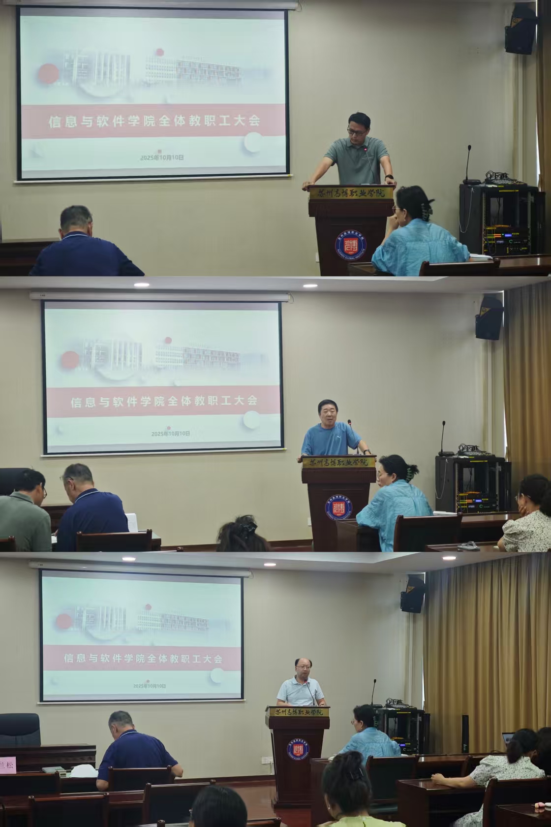 2025 年10月10日下午2点,信息与软件学院于14-215会议室隆重召开全体教职工大会,深入探讨学院发展现状,规划未来发展方向。本次会议由孙涌院长主持,学院领导班子成员及全体教职工参加。
