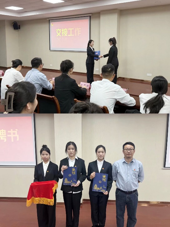 (图为高铭蔚同学交接工作与学生会骨干代表颁发聘书照片)