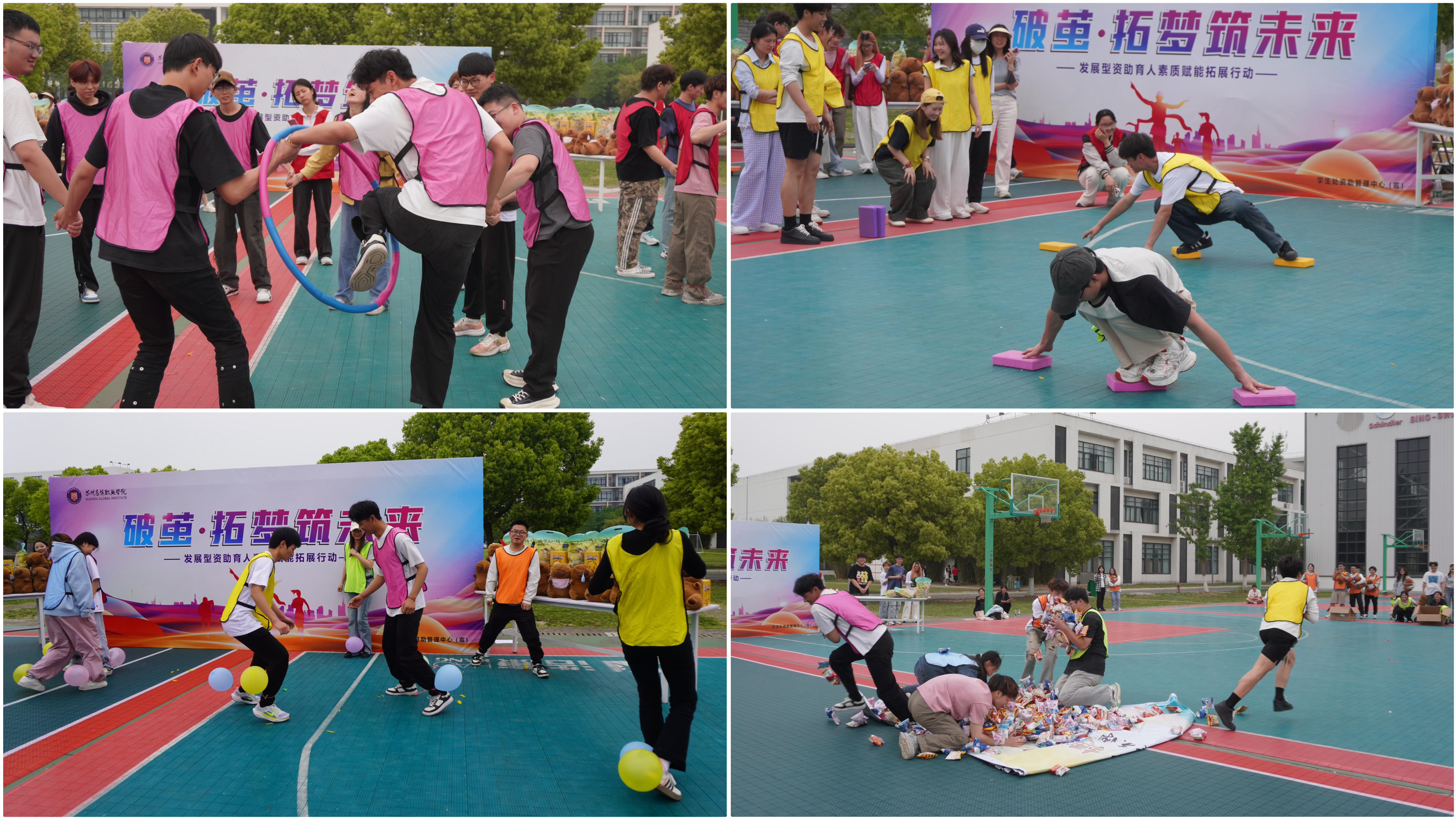 4月24日下午,学生处资助管理中心在校内体育场参加了一场素质拓展系列活动,学生处处长邹艳星、副处长周萍、各二级学院资助负责老师及60名受助学生代表一同参加。