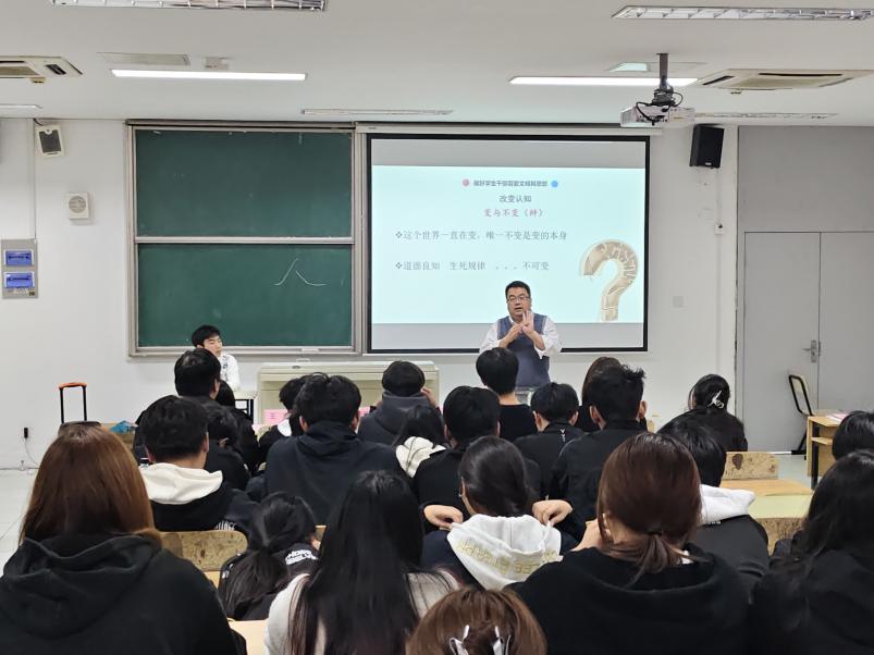 开班仪式结束后,郑兰松副书记以《浅谈如何做好一名学生干部》为题开启“开班第一课”。他结合十余年一线学生工作经历,围绕角色定位、软实力等方面,用鲜活案例阐释“学生干部不仅是一份荣誉,更是一份沉甸甸的责任”,课堂现场掌声、笑声此起彼伏,气氛热烈。
