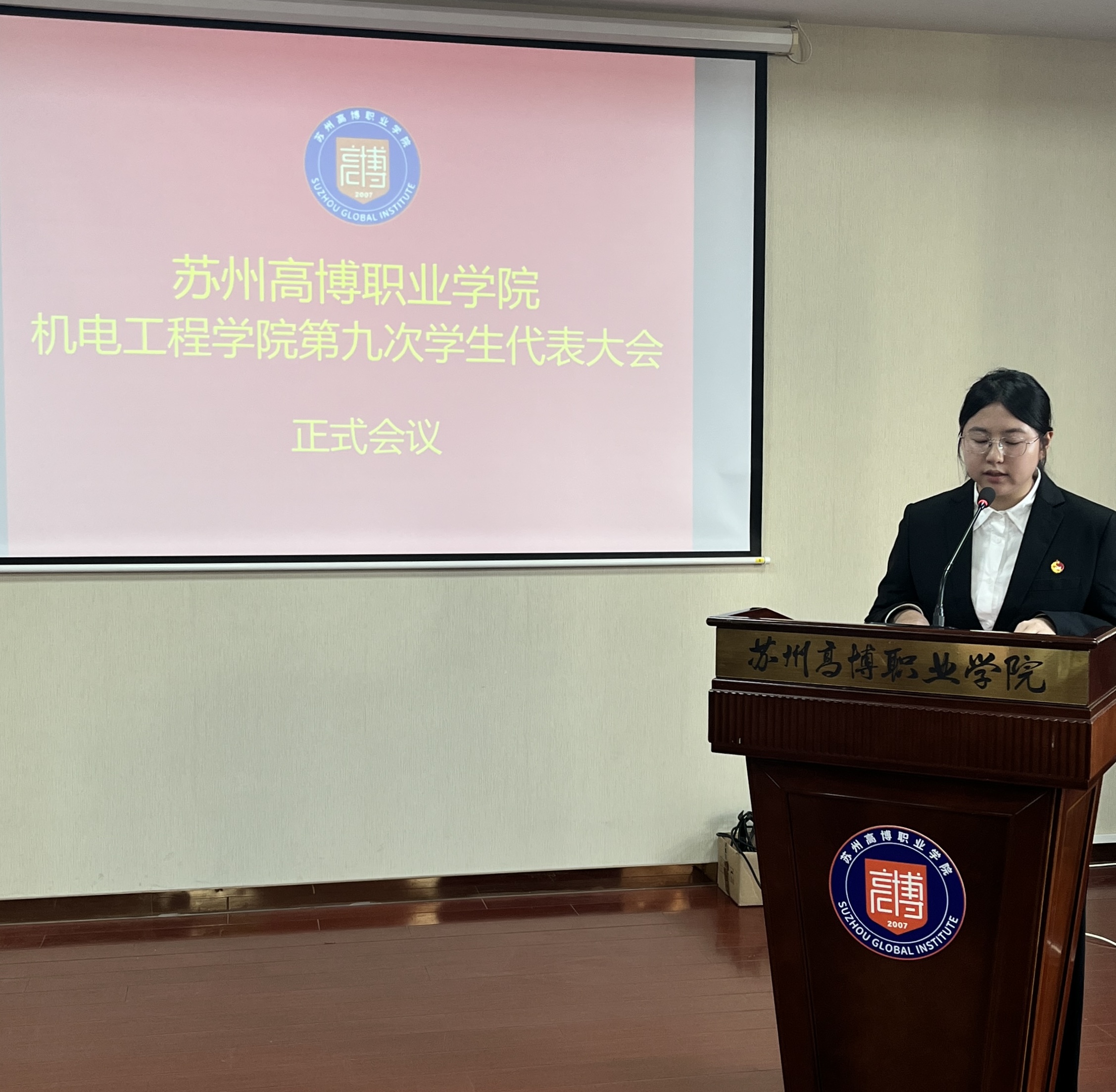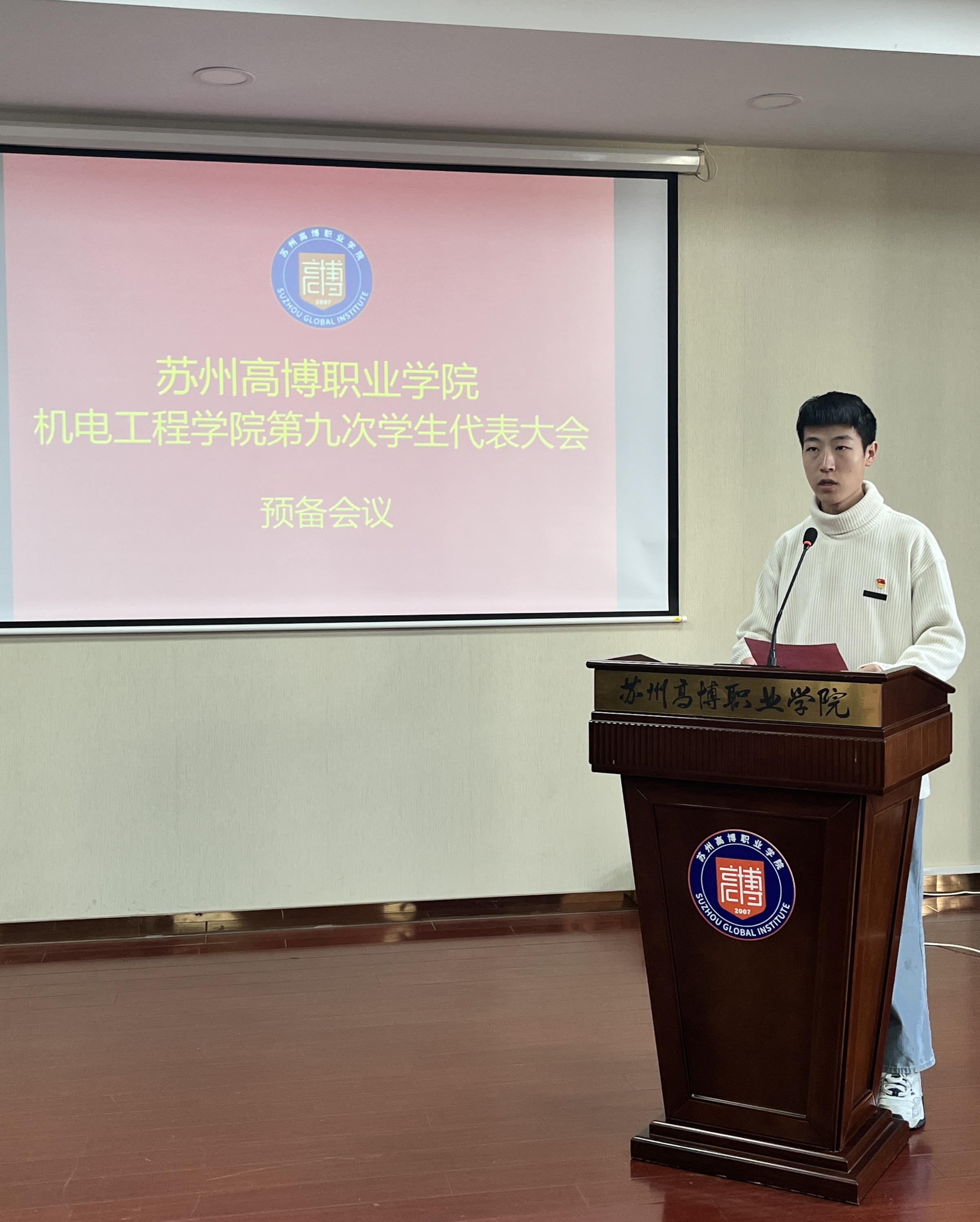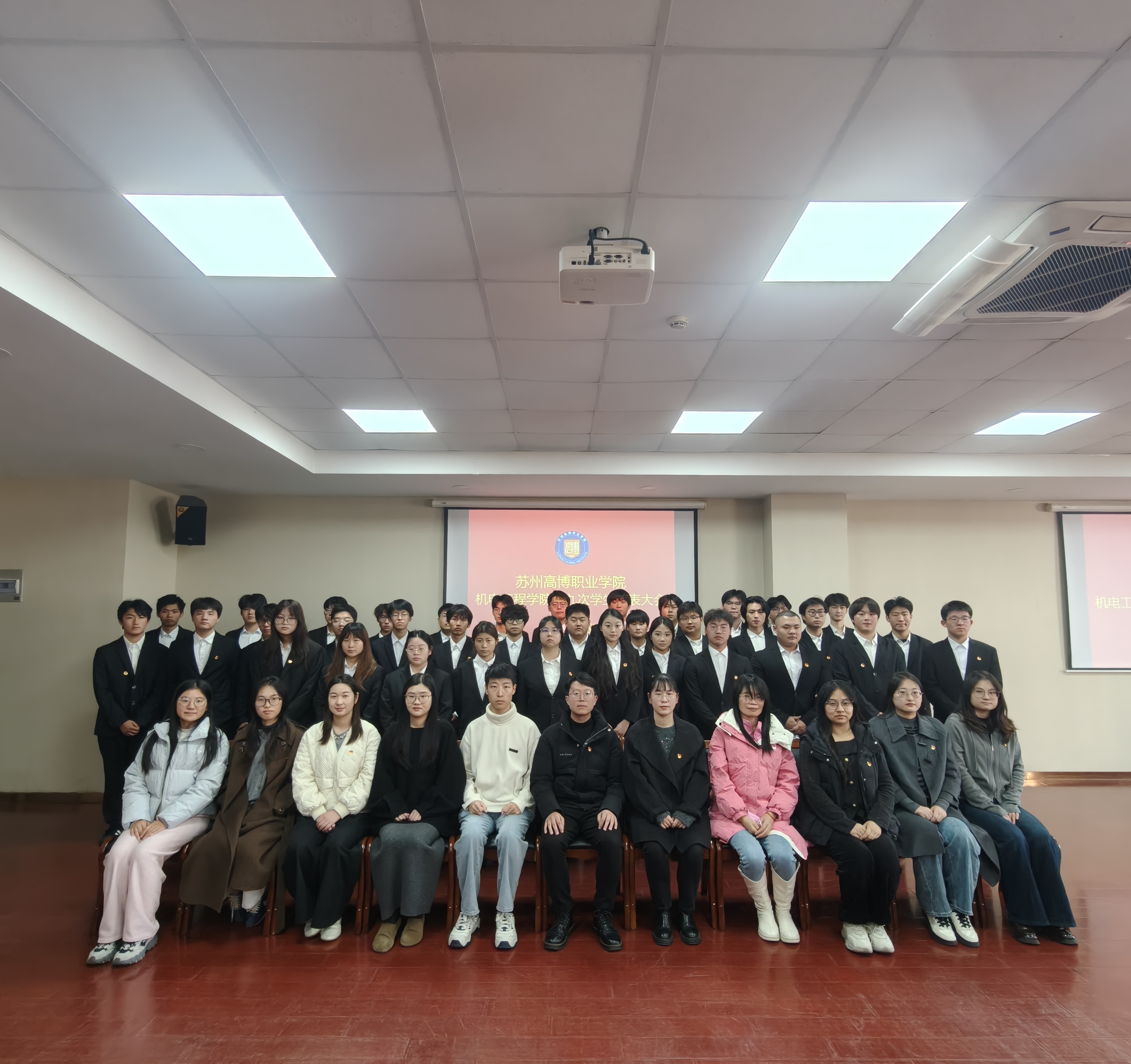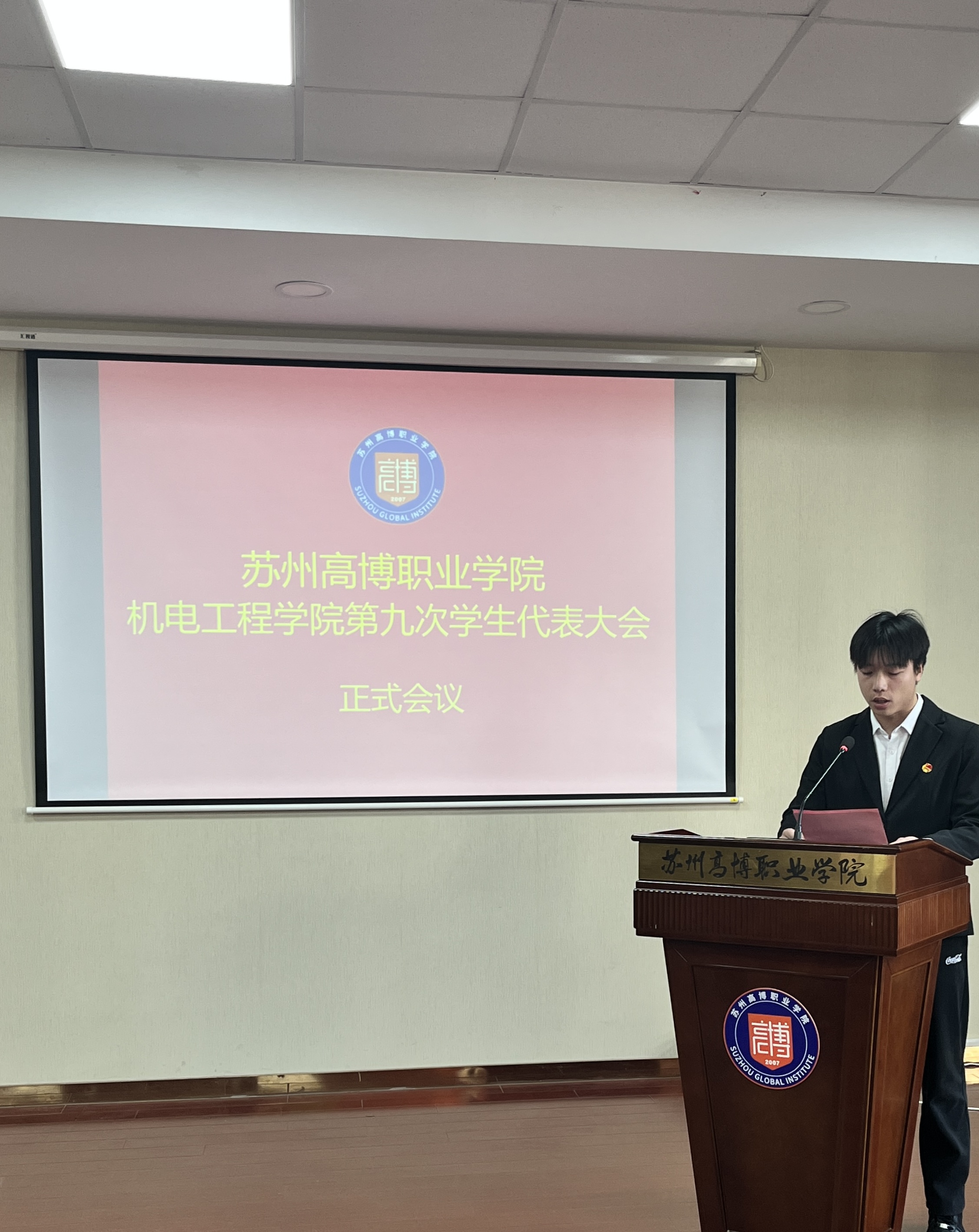 在校团委的关怀指导和学院党总支的正确领导下,在学校各部门和广大青年学生的大力支持下,经过精心筹划和准备,苏州高博职业学院机电工程学院第九次学生代表大会于2025年11月20日下午1:00在行政楼215学术报告厅顺利召开。机电工程学院党总支副书记、副院长陈粟裕、学工办主任王一迪、分团委书记施云、全体辅导员及36名学生代表出席会议。大会由袁思梦同学主持。