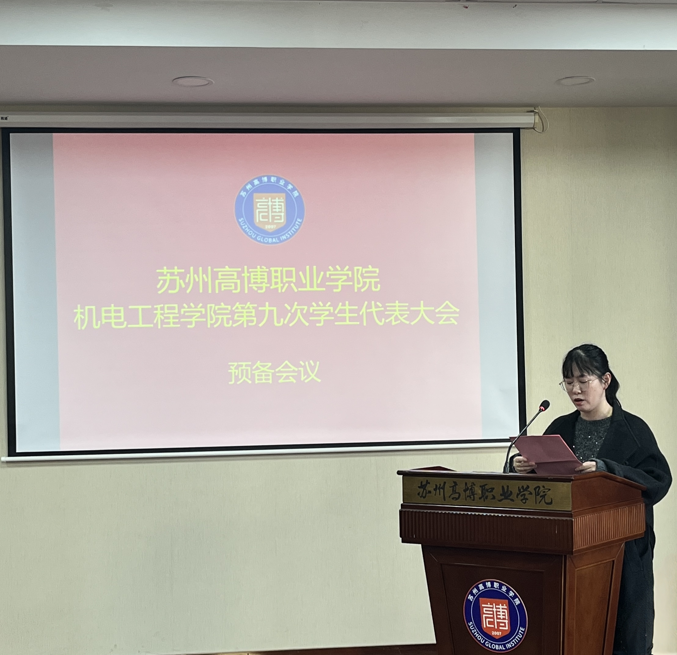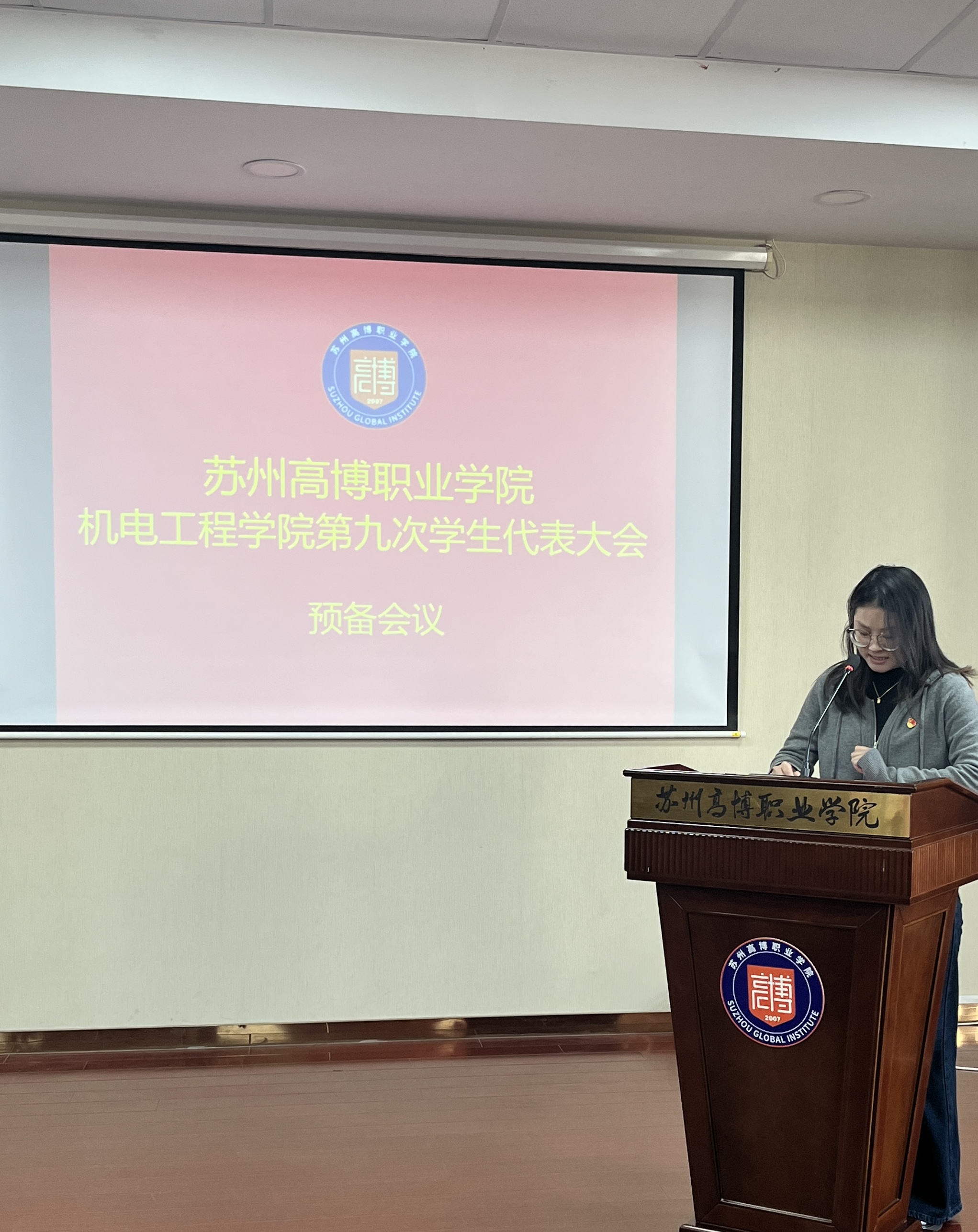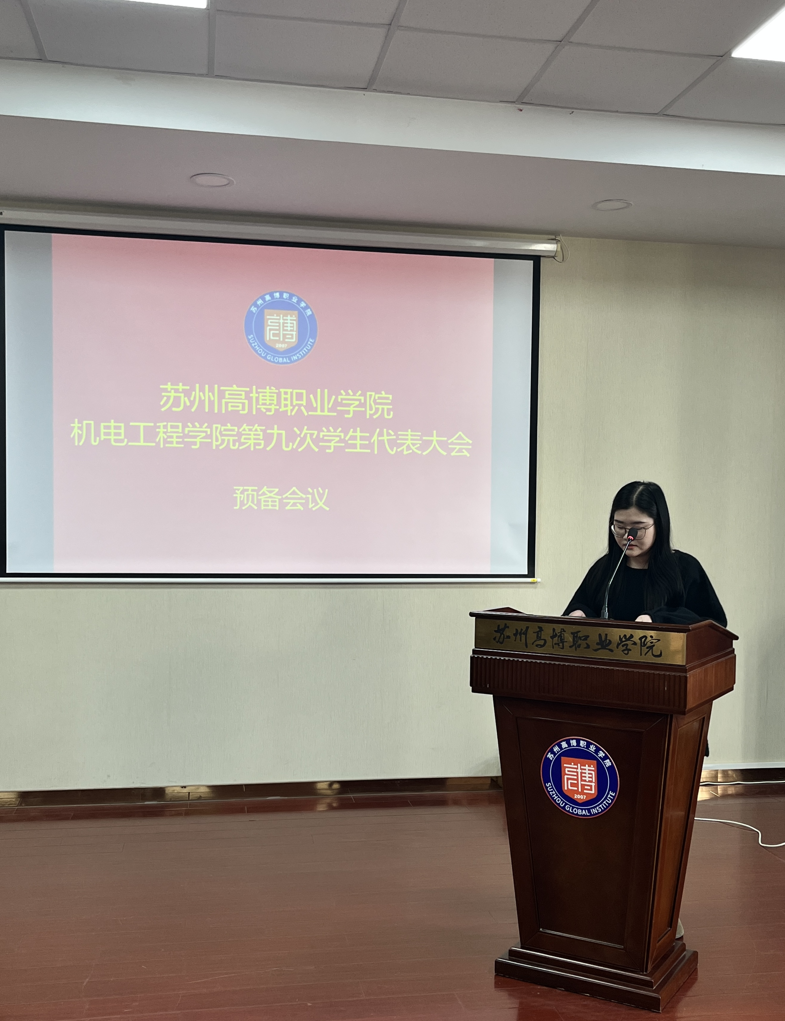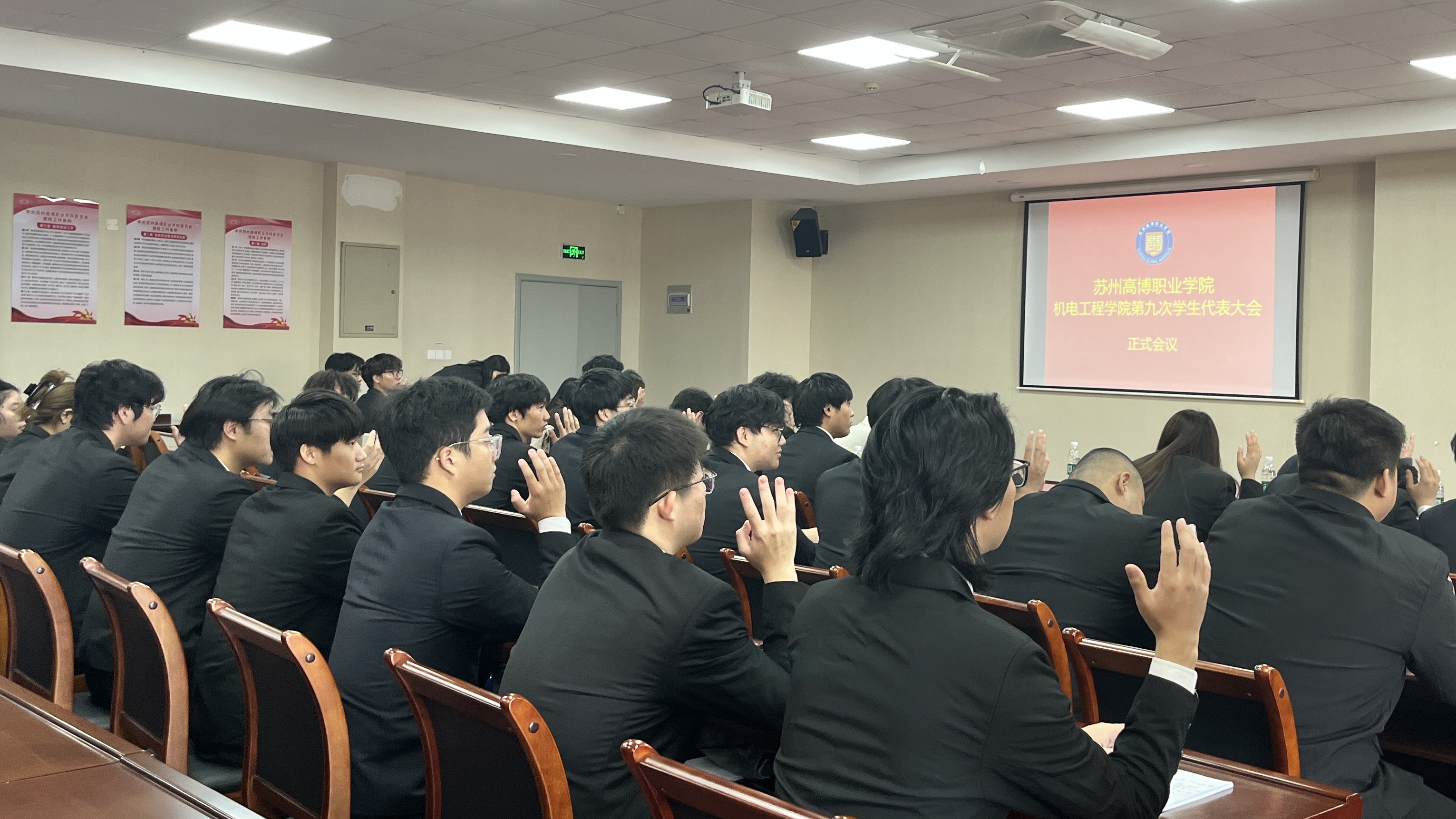 在校团委的关怀指导和学院党总支的正确领导下,在学校各部门和广大青年学生的大力支持下,经过精心筹划和准备,苏州高博职业学院机电工程学院第九次学生代表大会于2025年11月20日下午1:00在行政楼215学术报告厅顺利召开。机电工程学院党总支副书记、副院长陈粟裕、学工办主任王一迪、分团委书记施云、全体辅导员及36名学生代表出席会议。大会由袁思梦同学主持。