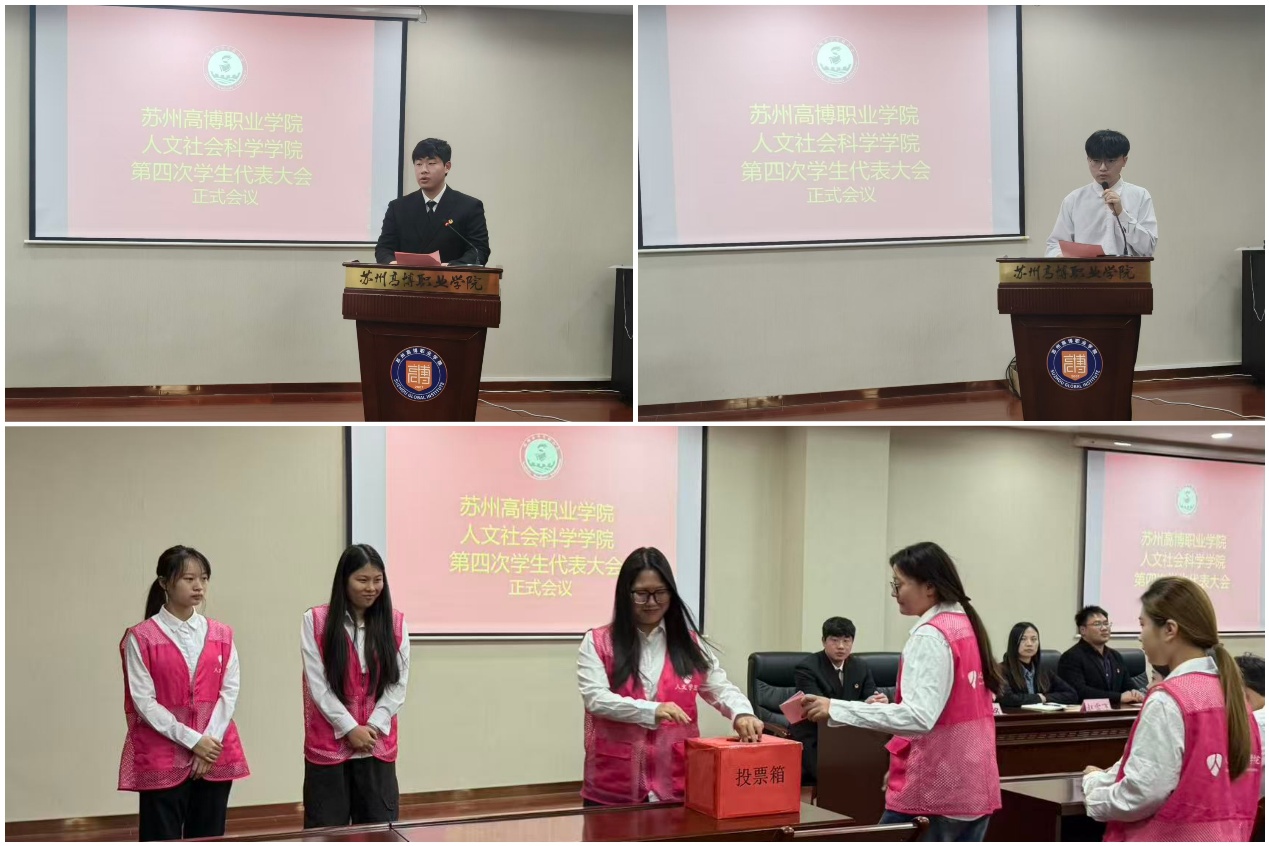 苏州高博职业学院人文社会科学学院第四次学生代表大会近日隆重举行。学院党总支副书记、副院长赵雪飞,分团委书记吴敬德出席会议,44名学生代表齐聚一堂,以青春担当为学院学生工作高质量发展注入新动能。