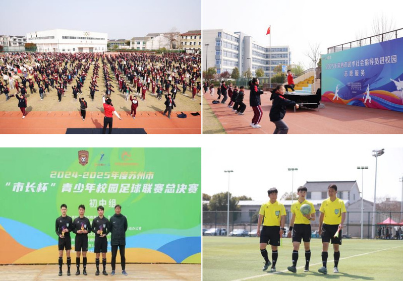 本次系列活动紧密结合各专业特点,精准对接社会需求。在体育专业领域,支部党员教师率先垂范,带领学生深入校园、社区及企业,广泛开展体育赛事组织与健身指导服务。党员教师谢媔媔长期在苏州科技城实验小学玉屏校区担任社团啦啦操教练,党员教师程叶则在该校长期负责校队乒乓球训练,为青少年体育启蒙与技能提升倾注心血。党员教师吴邦智多次执裁市级高水平篮球赛事,展现了专业的裁判素养。在已落幕的2025年苏州市“市长杯”初中女子组足球总决赛中,党员教师赵明旭带领休闲体育专业学生李健杰以裁判身份全程参与,李健杰同学更凭借出色表现荣获“最佳裁判员”称号,赵明旭老师亦在其他多项青少年足球赛事中承担裁判工作。此外,体育组朱柯老师走进常熟市碧溪中心小学,通过趣味武术教学让千余名学生领略了传统体育的魅力。党支部张赞书记更亲自带队,联合程叶、吴邦智、赵明旭等老师及休闲体育专业学生,为苏高新集团成功组织了篮球、羽毛球、乒乓球等系列赛事,志愿服务获得了主办方的高度认可。