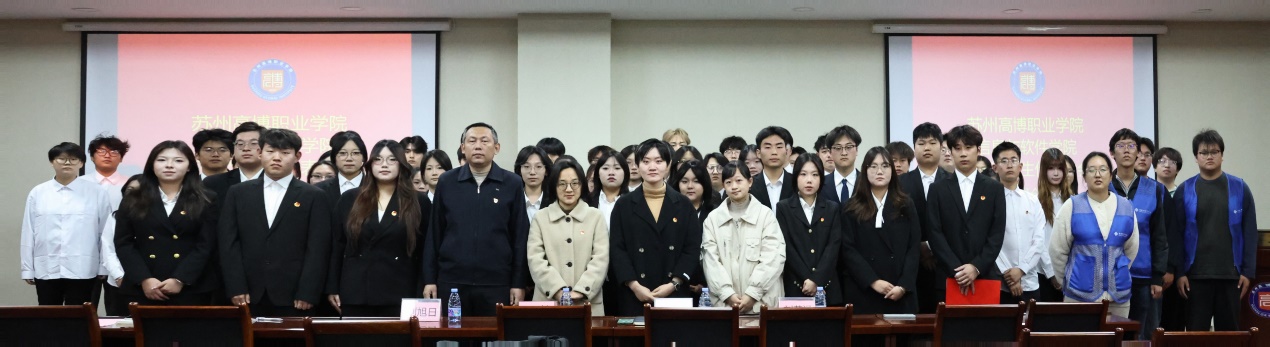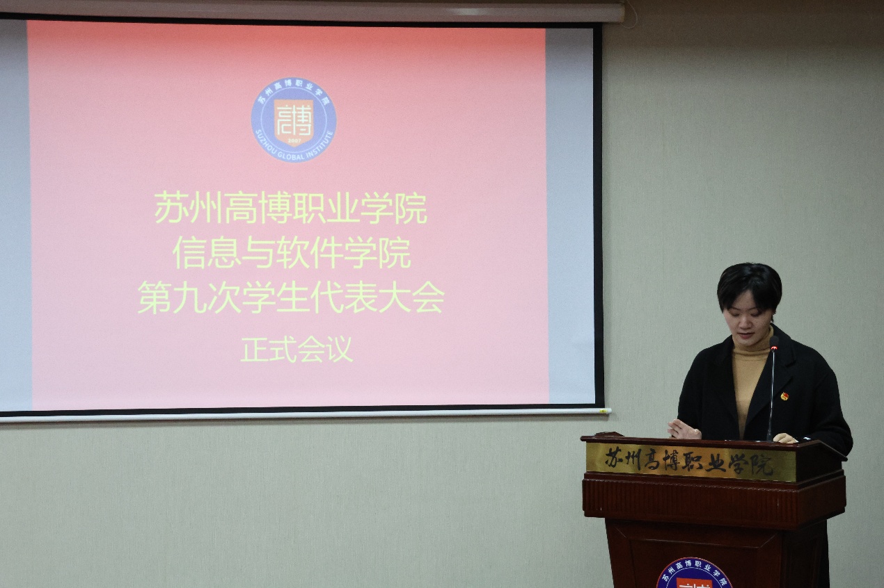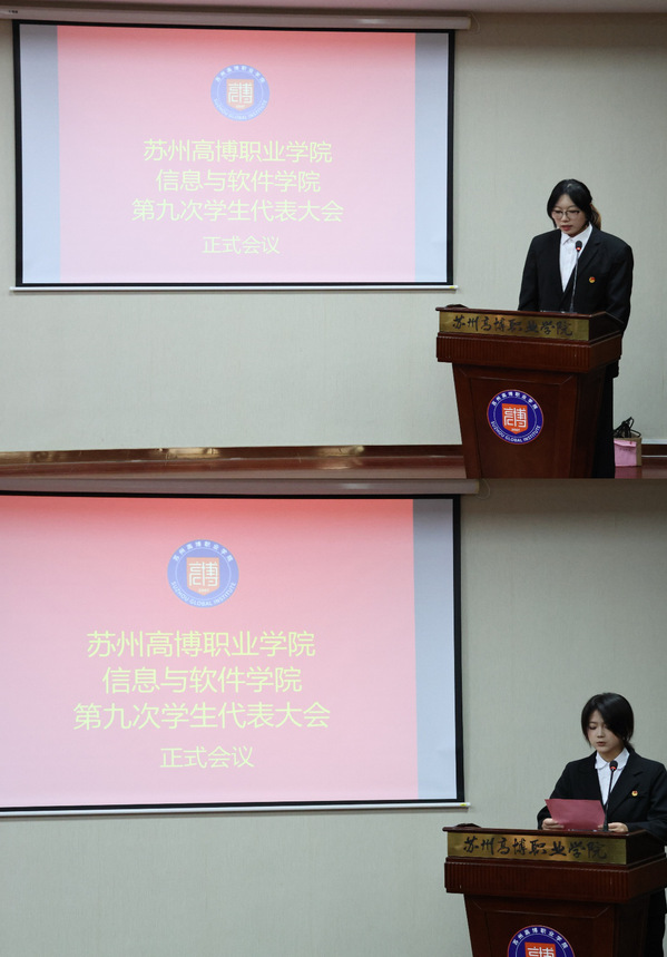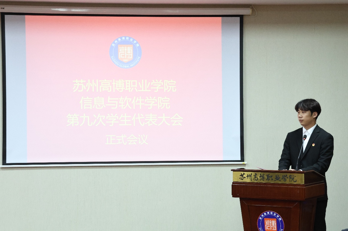 2025年11月26日下午4时45分,苏州高博职业学院信息与软件学院第九次学生代表大会在14-215会议室隆重召开。信息与软件学院学工办主任顾笑老师、分团委书记马介莉老师、学生党支部书记刘旭日老师、分团委委员刘若涵老师出席代表大会,全院共50名学生代表参会。会议由李鑫同学主持。大会在庄严的国歌声中拉开序幕,展现了青年学生的蓬勃朝气与爱国情怀。