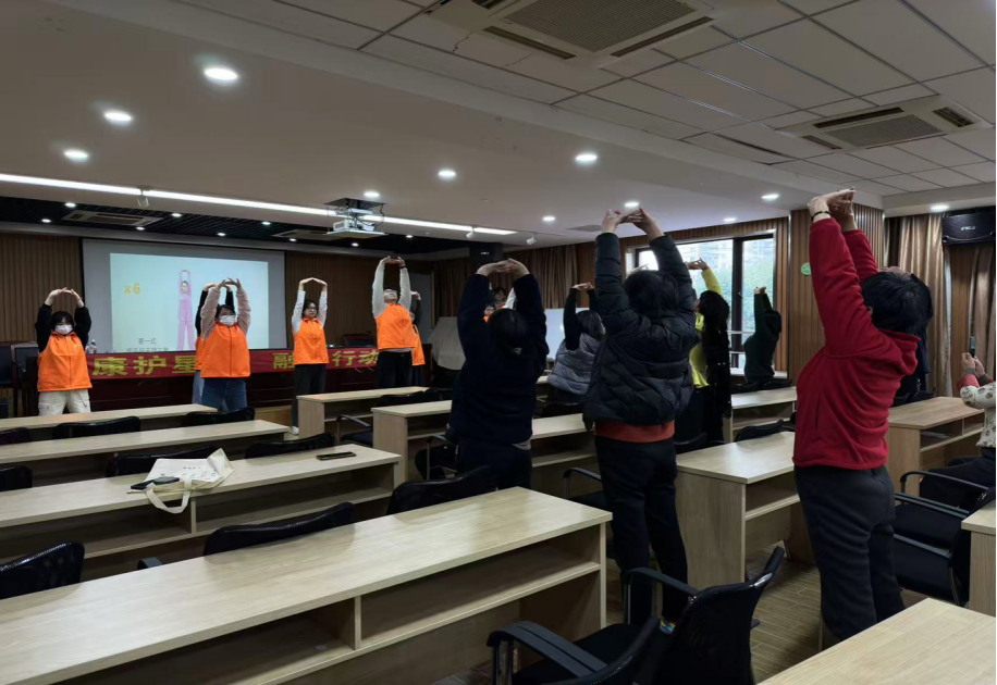 活动压轴环节,由学生党员志愿者带来了整齐划一的“八段锦”表演。志愿者们动作舒展、气韵流畅,充分展现了传统养生功法与现代康复理念的融合之美,也体现了康复系“传承中医康复文化”的专业特色。在志愿者的热情邀请下,社区居民纷纷加入学习队伍,党员志愿者一对一纠正动作、耐心讲解功法原理,现场氛围热烈融洽,让居民在亲身体验中感受中医康复文化的魅力,进一步丰富了“一专业一服务”的内容形式。