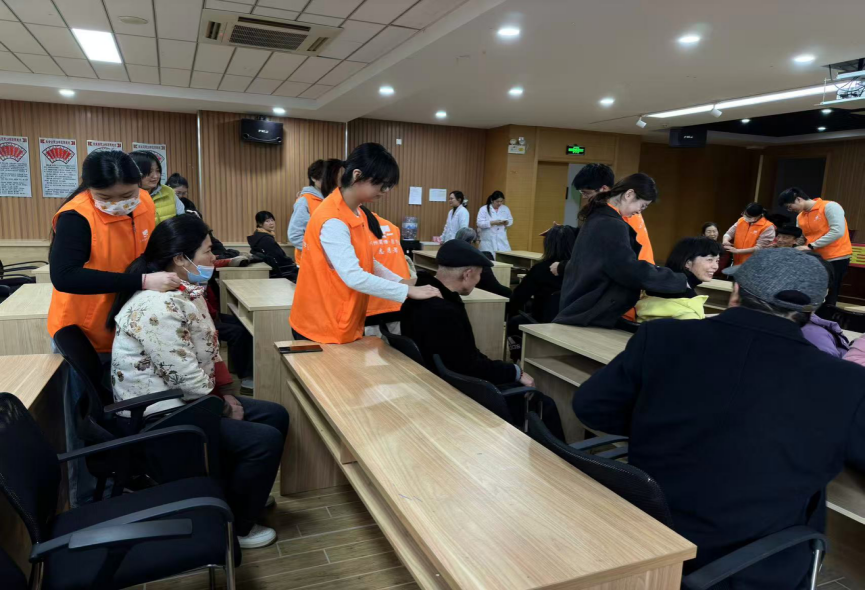 活动当日,志愿服务活动在社区正式启动。医学院康复系负责人带队统筹,学生党员志愿者主动亮身份、作表率,全程主导活动组织与服务开展。在宣教环节,学生党员代表围绕“残疾三级预防”理念,常见运动损伤的应急处理等内容,用通俗易懂的语言讲解了日常生活中的康复防护要点。针对社区老年居民肩颈腰不适高发的现状,党员志愿者现场示范上肢穴位按摩技巧与简易保健操,手把手指导居民掌握动作要领,让“居家康复”知识真正走进百姓生活。