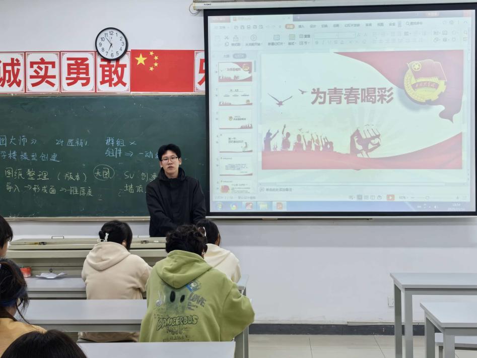 为激发我院学子的历史责任感和奋斗精神,2025127日晚上630分,艺术与建筑学院分团委在12-216教室开展一场以“为青春喝彩”为主题的新思想公开课。本次公开课由艺术与建筑学院学生会主席团成员张君豪同学主讲,全体2025级学生团员参加,共同为青春喝彩,为青春赋能。