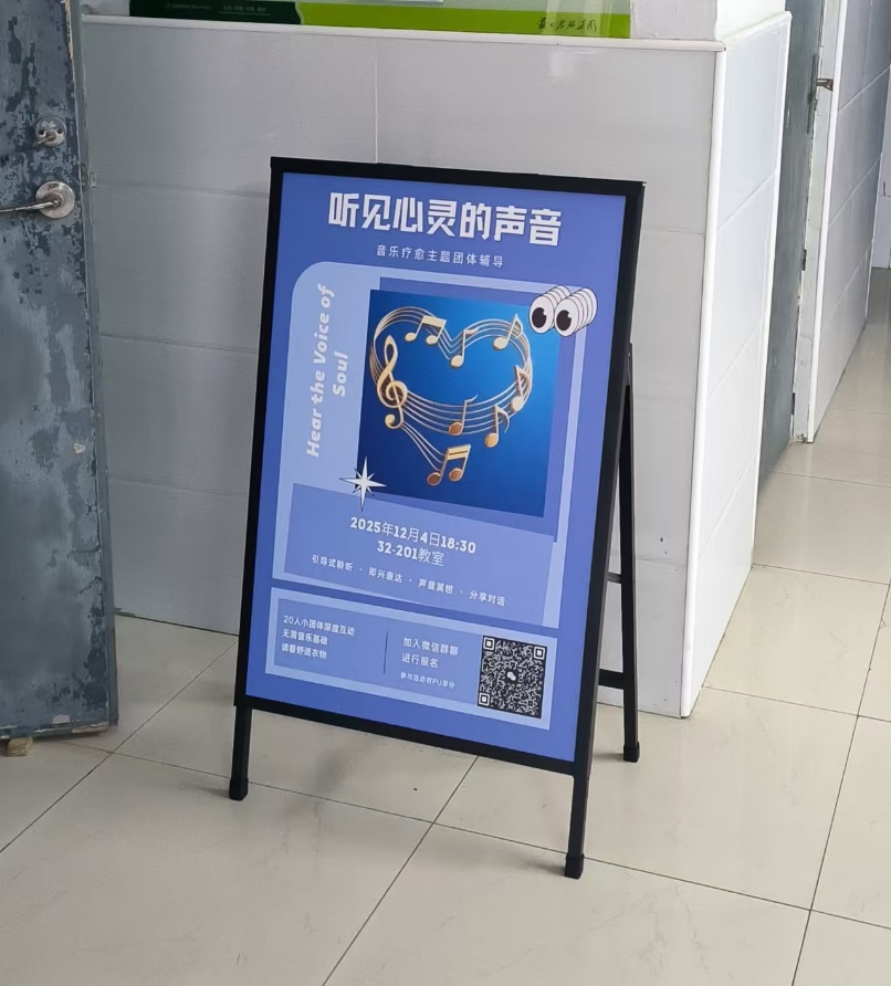活动经过一周多的精心筹备与全校范围宣传,通过宿舍楼下海报等多渠道招募成员,旨在探索音乐与心理健康的深层联结。晚上六点,活动在马老师的引导下正式开始。不同于传统心理讲座,现场摆放了多种乐器,营造出轻松而充满创造力的氛围。