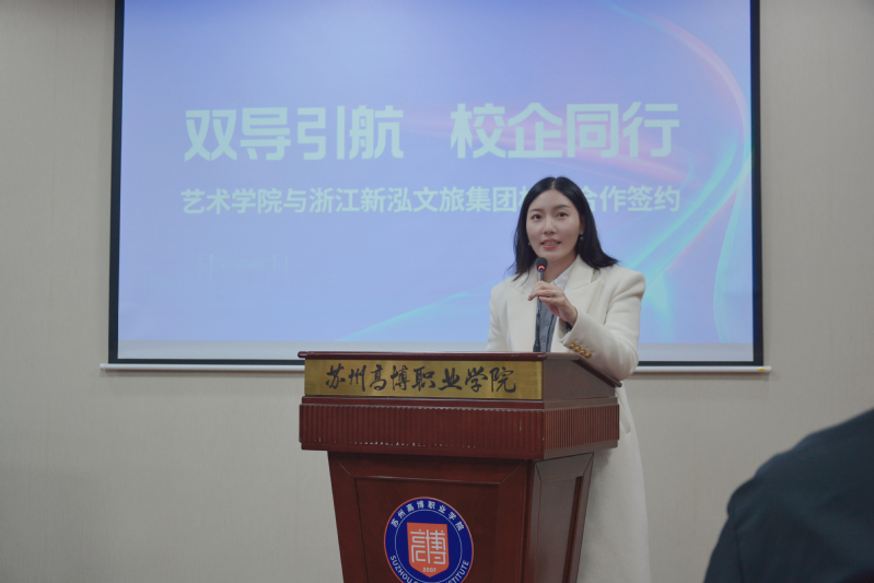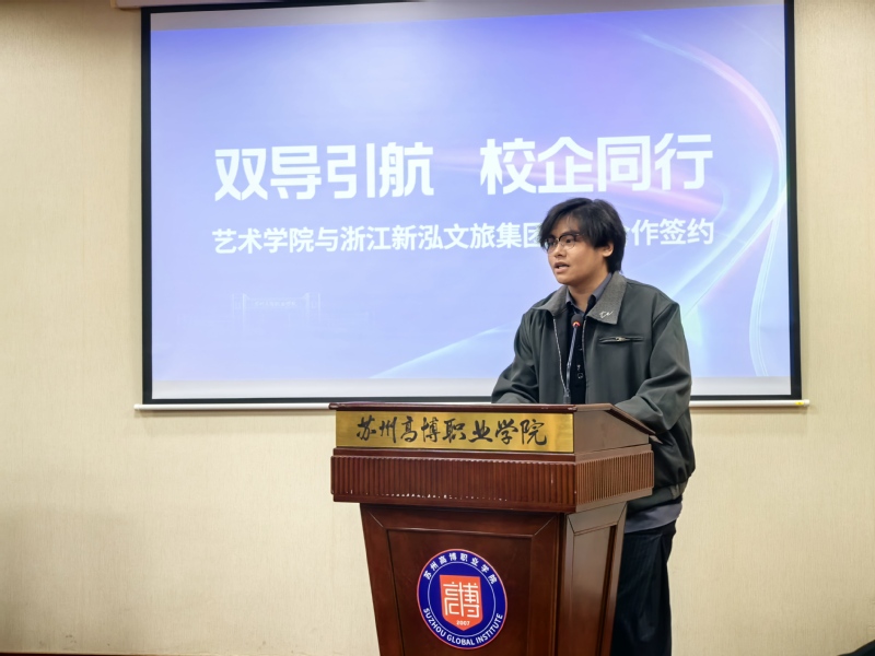 12月11日下午,苏州高博职业学院艺术学院与浙江新泓文旅集团在学校215报告厅隆重举行“双导引航 校企同行”合作签约暨融媒实战项目启动仪式。双方将围绕融媒体技术与运营专业建设,以“校企双导 +项目淬炼 + AI赋能”为核心路径,推动人才培养与产业需求精准对接,开启协同育人新篇章。