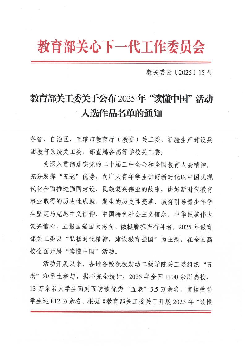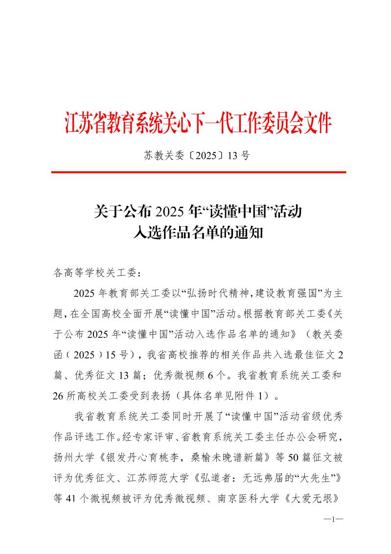 近日,教育部关工委发布了《关于公布2025年“读懂中国”活动入选作品名单的通知》(教关委函〔2025〕15号),我校关工委因组织得力、成绩突出获评“表扬单位”。同时,江苏省教育系统关工委也发布了《关于公布2025年“读懂中国”活动入选作品名单的通知》(苏教关委〔2025〕13号),我校关工委推荐上报的征文《铁血忠魂,薪火永传》入选2025年江苏省教育系统关工委“读懂中国”活动优秀征文;微视频《铁血忠魂,薪火永传》入选2025年江苏省教育系统关工委“读懂中国”活动优秀微视频。