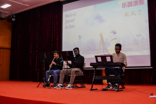 活动伊始,悠扬的乐声回荡全场,留学生代表Jarad、Daniel与Aidan联袂登台,以器乐合奏献上开场表演。三人默契配合,先后演绎《Hallelujah》和《起风了》两首佳作,深沉悠扬的旋律与灵动明快的节奏交织,既展现了扎实的音乐才华,也传递出“音乐无国界”的跨文化共鸣,为活动奠定了热烈温馨的基调。