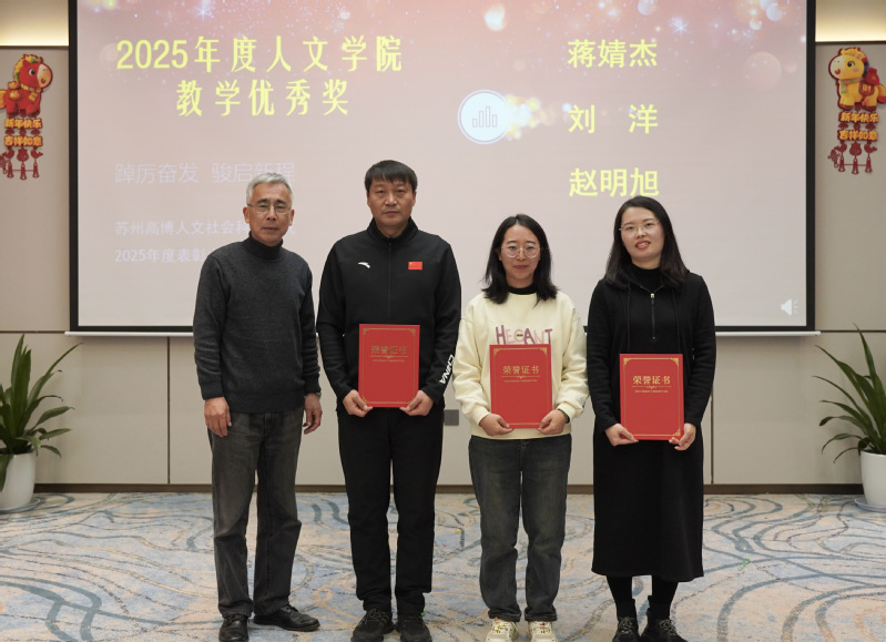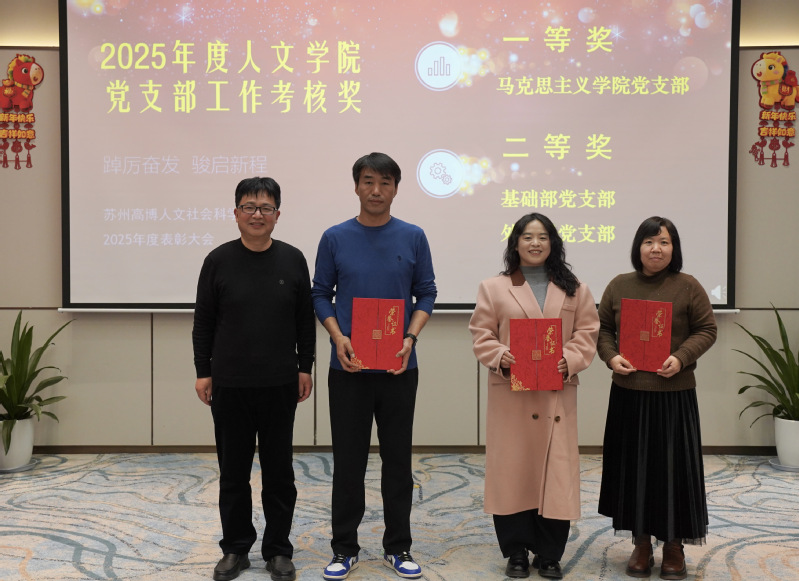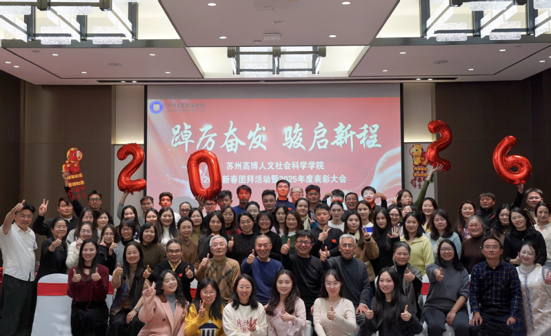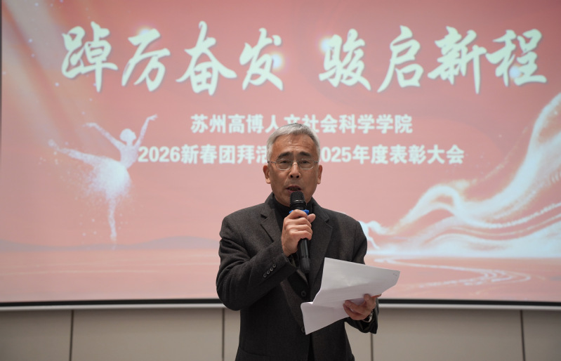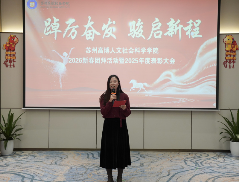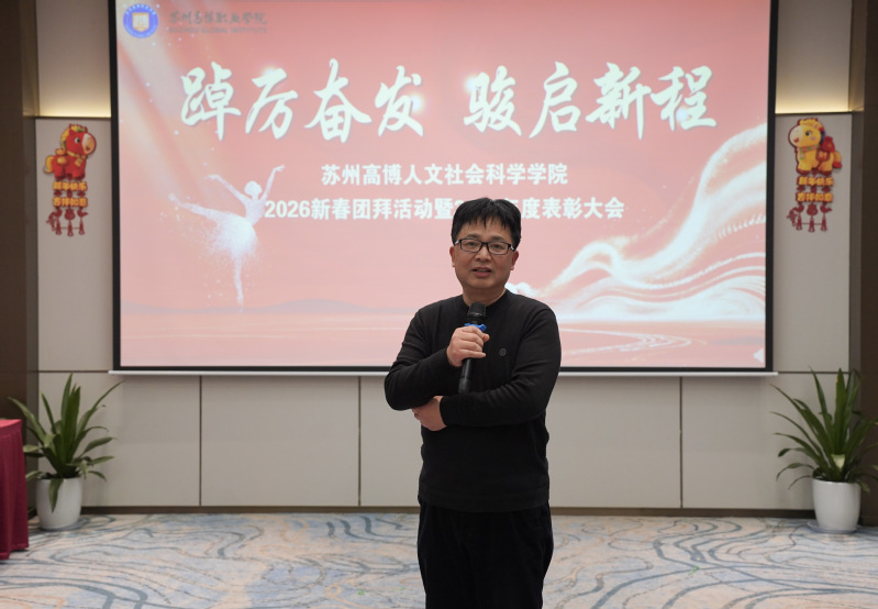 金蛇辞旧岁,骏马踏春来。2026年1月13日,人文社会科学学院在苏州龙之梦会议中心隆重举行新春团拜活动暨2025年度表彰大会。学院党政领导班子成员、全体教职工欢聚一堂,共迎新春,共谋新篇,共话新程。大会以“踔厉奋发,骏启新程”为主题,旨在总结过去、表彰先进、展望未来。大会由学院党总支副书记、副院长赵雪飞主持。
