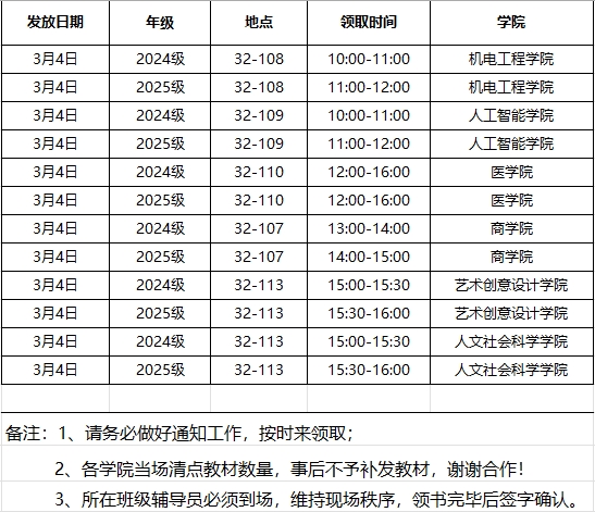 关于2025-2026-2学期2024级2025级教材发放安排的通知