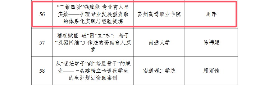 在案例申报环节,学生处周萍老师立足自身多年从事学生资助工作的实践经验,聚焦资助育人核心目标,系统梳理工作中的典型做法、特色举措与实践成效,精心凝练形成高质量工作案例,凭借鲜明的针对性、较强的实用性和突出的育人价值,在众多申报案例中脱颖而出,获评江苏省资助育人工作案例。