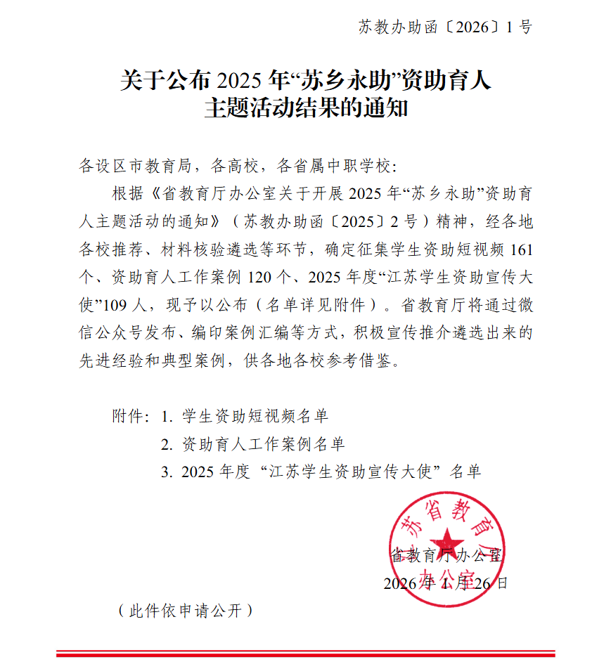 自江苏省2025年度“苏乡永助”资助育人主题活动启动以来,我校高度重视、积极响应,将此次活动作为深化资助育人工作、提升育人实效的重要契机,由学生资助管理中心牵头统筹,精心制定实施方案、周密部署推进流程,各学院密切配合,有序开展案例征集、候选人遴选等系列工作。