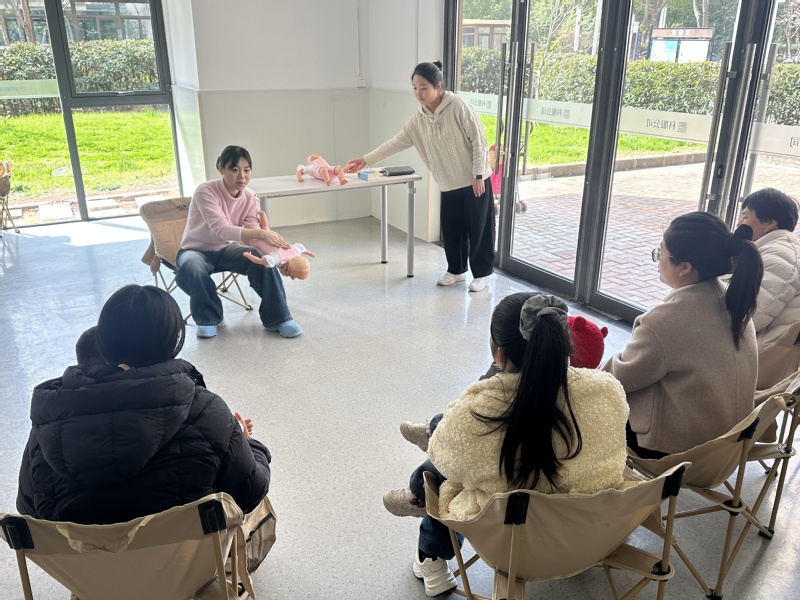 活动严格对标赛项核心模块,分设三大服务区域。认知活动按分龄标准设计,通过绘本互动、触感游戏引导宝宝识别颜色与形状,锻炼指令理解能力;大运动环节参照赛项实操规范,设置爬行、平衡、扶走等亲子训练,精准锻炼婴幼儿肢体协调与核心力量。在安全急救板块,志愿者紧扣赛项重点,以模型演示气管异物梗阻的应急处理,手把手指导家长掌握1岁以下拍背压胸、1岁以上腹部冲击的标准流程。
