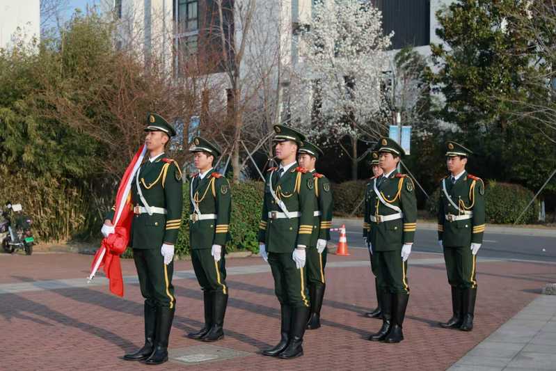 晨曦初露,国旗护卫队队员迈着铿锵有力的步伐,护送鲜艳的五星红旗走向升旗台。在激昂的国歌声中,五星红旗冉冉升起,在春风中高高飘扬,全体师生庄严肃立,向国旗行注目礼,爱国之情激荡在每个人心中。