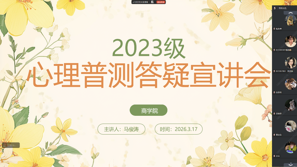 为积极响应学校健康教育中心关于开展2023级春季心理普测工作的通知要求,切实做好毕业生心理健康关怀与服务工作,帮助2023级学生全面了解心理普测的重要意义及操作流程,商学院于3月17日中午12点成功举办线上答疑宣讲会。本次活动由学院心理辅导员马俊涛老师主讲,近半数2023级学生在线参与。