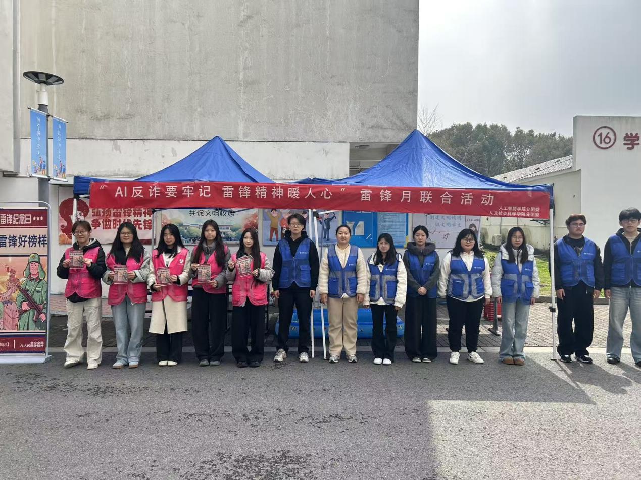 为传承弘扬雷锋精神,加强校园安全教育,提升学生反诈意识与能力,营造平安校园环境,在3・25全国学雷锋志愿服务日之际,人工智能学院分团委、人文社会科学学院分团委联合组织开展“AI反诈要牢记 雷锋精神暖人心”主题活动。本次活动依托两院联合制定方案,创新采用“知识答题+趣味互动”形式,13名学子化身志愿者,以青春行动传递奉献温度,守护校园安全。