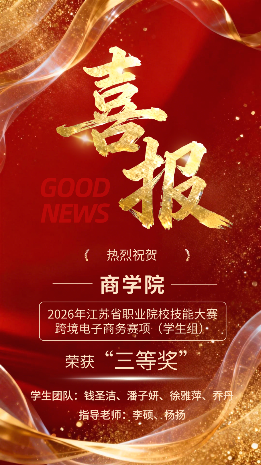 4月6日,2026年江苏省职业院校技能大赛(高职组)跨境电子商务赛项圆满落幕。经过激烈角逐,由学校商学院李硕、杨扬两位老师悉心指导,我校钱圣洁、潘子妍、徐雅萍、乔丹4位同学组成的参赛团队,凭借扎实的专业功底、出色的实战能力与默契的团队协作,在全省众多参赛队伍中脱颖而出,荣获三等奖,为学校再添荣誉!