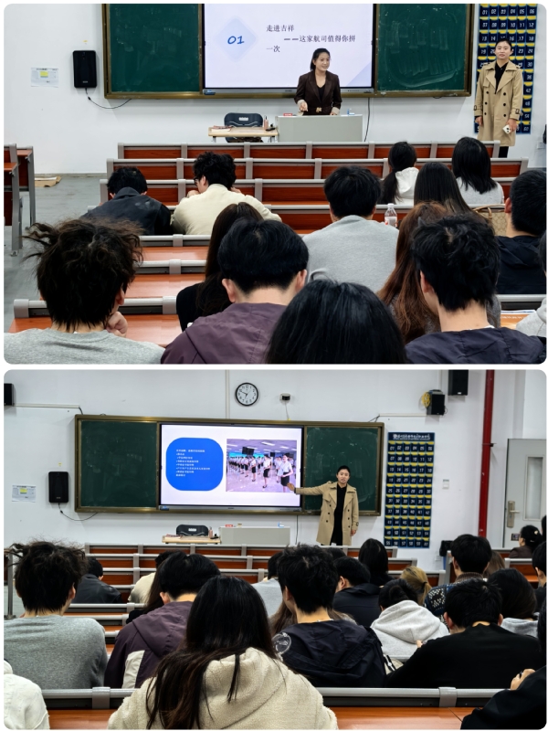 宣讲会上,李老师结合吉祥航空的企业文化与用人标准,从简历撰写、形象管理、语言表达、情景模拟等多个维度,系统讲解了乘务员、安检员等岗位的面试全流程。冯老师则深入解读了 2026 年吉祥航空的招聘政策,并通过分享通关攻略、专业培训等实用内容,帮助学生提前规划求职路径,使他们在校内就能零距离接触企业的用人标准与面试实战技巧。