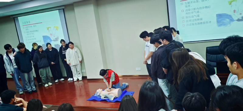 培训伊始,校团委副书记蒋老师为本次活动作开场讲话。他指出,学生骨干是校园管理、服务同学的核心力量,掌握基础急救技能,不仅能在突发状况下保护自身与身边同学的生命安全,更能在校园应急处置中发挥关键作用。他希望全体学生骨干珍惜学习机会,认真聆听、积极实操,真正把急救知识学深悟透、熟练运用。