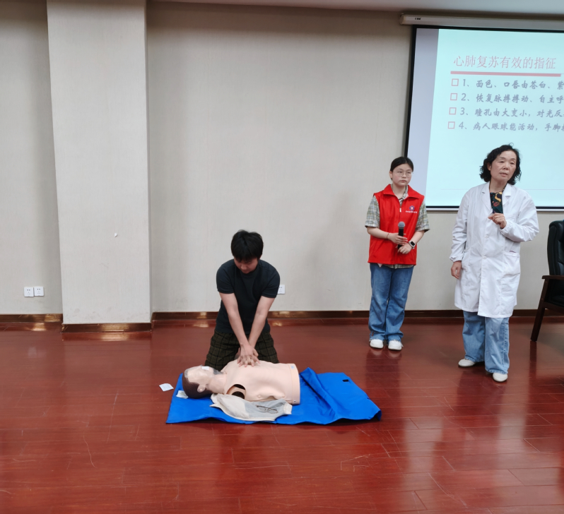 本次培训邀请校医院糜医生担任主讲嘉宾,围绕心肺复苏(CPR)、AED自动体外除颤器使用两大核心急救技能,采用理论知识讲解与现场实操演练相结合的形式,为同学们带来了专业且实用的急救课程。理论讲解环节,糜医生结合校园常见突发健康案例,用通俗易懂的语言,详细讲解了心跳呼吸骤停的判断方法、心肺复苏操作流程、按压部位、按压频率与深度、人工呼吸操作要点,以及AED设备的功能、使用场景和操作规范,逐一拆解急救过程中的关键细节与注意事项,纠正了大家日常对急救知识的认知误区,让全体学员全面掌握了基础急救理论知识。实操演练环节,糜医生借助专业急救模拟人,现场完整演示了从判断患者意识、拨打急救电话、摆放急救体位,到规范实施胸外按压、人工呼吸,再到配合使用AED的全流程操作,动作标准、讲解细致。演示结束后,同学们上台进行实操练习,糜医生全程耐心指导,逐一纠正大家在按压姿势、力度、频率等方面的不规范操作,带领大家掌握正确的急救手法,确保学生骨干都能熟悉操作流程、掌握实操技能。