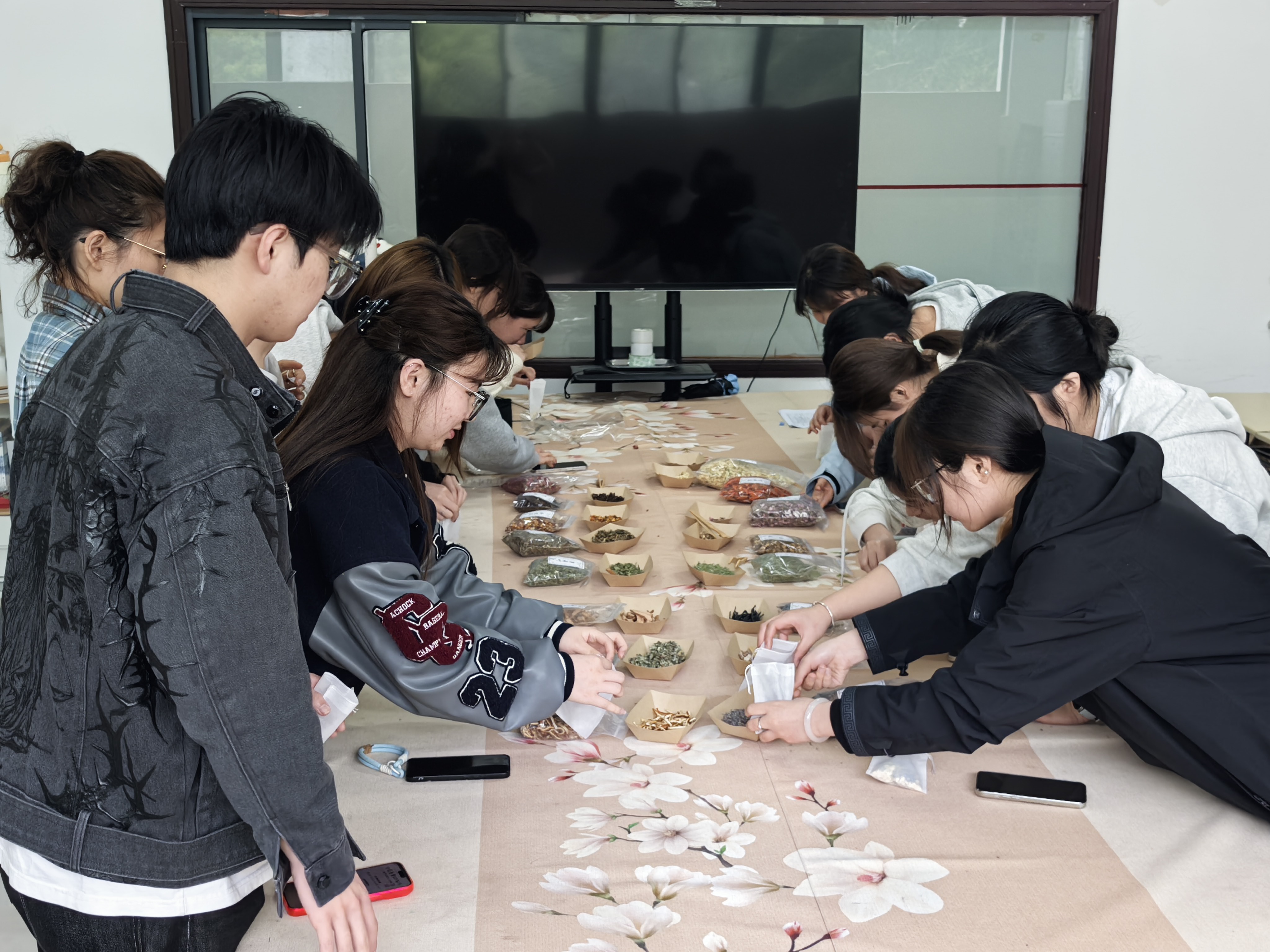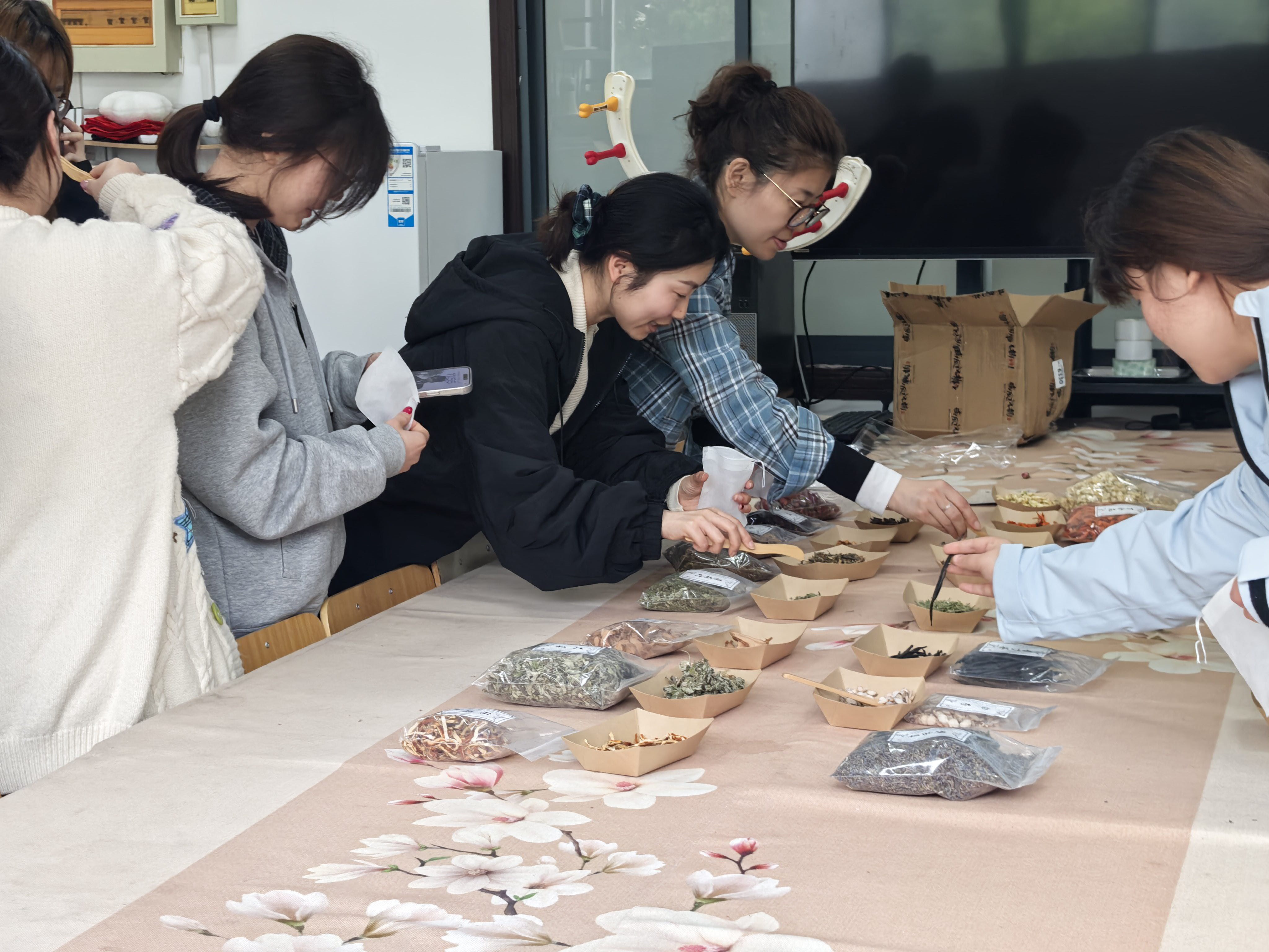 活动现场,空气中弥漫着合欢花、白芷、艾叶等16种天然本草的清新气息,桌上整齐摆放着各色绸缎香囊袋,一旁清晰陈列着四种经典配方及功效说明,供师生们按需参考、自由选取。