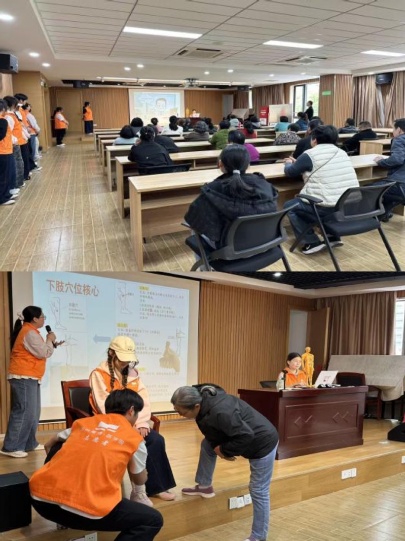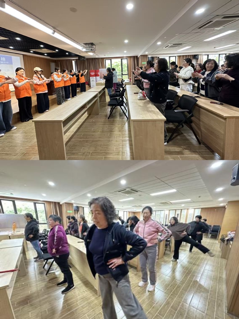 为了让居民真正学到实用的保健技能,活动现场设置了实操教学环节。志愿者现场示范并分步教学了常用保健穴位按摩方法、健脑手指操以及骨质疏松康复操,一边演示一边讲解动作要点与注意事项,居民们跟随节奏认真练习,现场氛围轻松又热烈。对于部分动作不规范的居民,志愿者们还逐一上前指导纠正,确保大家基本能掌握规范的操作方法。